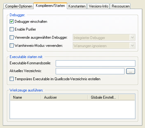 Dieser Bereich beinhaltet Optionen, welche beeinflussen, wie das Executable zum Testen von der IDE aus gestartet wird. Mit Ausnahme der Werkzeuge-Option haben diese keinen Effekt, wenn der Menüpunkt "Executable erstellen" verwendet wird.Debugger einschalten