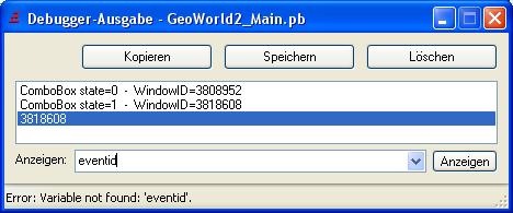 Das Fenster mit der Debugger-Ausgabe wird automatisch geöffnet, sobald die erste Ausgabe durch Ihr Programm produziert wird. Wenn Sie es dann schließen, wird es bei nachfolgenden Nachrichten nicht automatisch geöffnet, diese werden jedoch trotzdem aufgezeichnet. Sie können diese Ausgabe in die Zwischenablage kopieren oder in eine Datei speichern. Es gibt auch einen Schalter, um die Nachrichten im Fenster zu löschen.