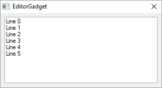 If OpenWindow(0, 0, 0, 322, 150, "EditorGadget", #PB_Window_SystemMenu | #PB_Window_ScreenCentered) EditorGadget(0, 8, 8, 306, 133) For a = 0 To 5 AddGadgetItem(0, a, "Zeile "+Str(a)) Next Repeat : Until WaitWindowEvent() = #PB_Event_CloseWindow EndIf