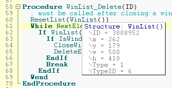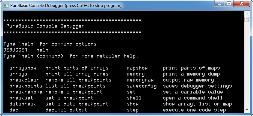PureBasic provides a powerful debugger that helps you find mistakes and bugs in your source code. It lets you control the program execution, watch your variables, arrays or lists or display debug output of your programs. It also provides advanced features for assembly programmer to examine and modify the CPU registers or view the program stack, or the Memory of your program. It also provides the possibility to debug a program remotely over the network.The Debugger integrated into the IDE