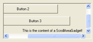 If OpenWindow(0, 0, 0, 305, 140, "ScrollAreaGadget", #PB_Window_SystemMenu | #PB_Window_ScreenCentered) ScrollAreaGadget(0, 10, 10, 290,120, 375, 155, 30) ButtonGadget (1, 10, 10, 230, 30,"Button 1") ButtonGadget (2, 50, 50, 230, 30,"Button 2") ButtonGadget (3, 90, 90, 230, 30,"Button 3") TextGadget (4,130,130, 230, 20,"This is the content of a ScrollAreaGadget!",#PB_Text_Right) CloseGadgetList() Repeat Select WaitWindowEvent() Case #PB_Event_CloseWindow End Case #PB_Event_Gadget Select EventGadget() Case 1 MessageRequester("Info","Button 1 was pressed!",#PB_MessageRequester_Ok) Case 2 MessageRequester("Info","Button 2 was pressed!",#PB_MessageRequester_Ok) Case 3 MessageRequester("Info","Button 3 was pressed!",#PB_MessageRequester_Ok) EndSelect EndSelect ForEver EndIf