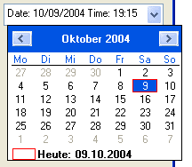 With the optional Mask$ parameter you can specify the format in which the date can be entered. See FormatDate() for the format of this mask. Important note: The gadget does not support the display of seconds, so if you specify "%ss" in the Mask$ parameter, it will simply be ignored! If you don't specify the mask or specify an empty string, a default mask will be choosen. The mask can be modified with the SetGadgetText() command. With the optional Date parameter you can set the displayed date to any date of your choise. Not specifying it or specifying a 0 value will display the current date. By default, the gadget has a button to display a calendar in which the user can choose a date (see image below). You can change this by specifying #PB_Date_UpDown in the Flags parameter. This will make the gadget display an up/down button that lets the user change the current selected part of the gadget.