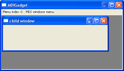 Example:#Main = 0 #MDIChild = 1 If OpenWindow(#Main, 0, 0, 400, 300, "MDIGadget", #PB_Window_SystemMenu|#PB_Window_ScreenCentered|#PB_Window_SizeGadget|#PB_Window_MaximizeGadget) If CreateGadgetList(WindowID(#Main)) And CreateMenu(#Main, WindowID(#Main)) MenuTitle("Menu index 0") MenuTitle("MDI windows menu") MenuItem(0, "self created item") MenuItem(1, "self created item") MDIGadget(0, 0, 0, 0, 0, 1, 2, #PB_MDI_AutoSize) AddGadgetItem(0, #MDIChild, "child window") CreateGadgetList(WindowID(#MDIChild)) ; add gadgets here... UseGadgetList(WindowID(#Main)) ; go back to the main window gadgetlist EndIf Repeat : Until WaitWindowEvent()=#PB_Event_CloseWindow EndIf