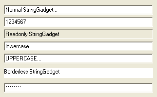 Example:; Shows possible flags of StringGadget in action... If OpenWindow(0, 0, 0, 322, 205, "StringGadget Flags", #PB_Window_SystemMenu | #PB_Window_ScreenCentered) And CreateGadgetList(WindowID(0)) StringGadget(0, 8, 10, 306, 20, "Normal StringGadget...") StringGadget(1, 8, 35, 306, 20, "1234567", #PB_String_Numeric) StringGadget(2, 8, 60, 306, 20, "Readonly StringGadget", #PB_String_ReadOnly) StringGadget(3, 8, 85, 306, 20, "lowercase...", #PB_String_LowerCase) StringGadget(4, 8, 110, 306, 20, "uppercase...", #PB_String_UpperCase) StringGadget(5, 8, 140, 306, 20, "Borderless StringGadget", #PB_String_BorderLess) StringGadget(6, 8, 170, 306, 20, "Password", #PB_String_Password) Repeat : Until WaitWindowEvent() = #PB_Event_CloseWindow EndIf