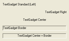 Example:If OpenWindow(0, 0, 0, 270, 160, "TextGadget", #PB_Window_SystemMenu | #PB_Window_ScreenCentered) And CreateGadgetList(WindowID(0)) TextGadget(0, 10, 10, 250, 20, "TextGadget Standard (Left)") TextGadget(1, 10, 70, 250, 20, "TextGadget Center", #PB_Text_Center) TextGadget(2, 10, 40, 250, 20, "TextGadget Right", #PB_Text_Right) TextGadget(3, 10, 100, 250, 20, "TextGadget Border", #PB_Text_Border) TextGadget(4, 10, 130, 250, 20, "TextGadget Center + Border", #PB_Text_Center|#PB_Text_Border) Repeat : Until WaitWindowEvent() = #PB_Event_CloseWindow EndIf