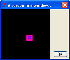 Example 1: (fixed screen size with gadgets)If InitSprite() = 0 MessageRequester("Error", "Can't open screen & sprite enviroment!", 0) End EndIf If OpenWindow(0, 0, 0, 220, 160, "A screen in a window...", #PB_Window_SystemMenu | #PB_Window_ScreenCentered) If CreateGadgetList(WindowID(0)) ButtonGadget(0, 170, 135, 45, 20, "Quit") EndIf If OpenWindowedScreen(WindowID(0), 0, 0, 160, 160, 0, 0, 0) CreateSprite(0, 20, 20) If StartDrawing(SpriteOutput(0)) Box(0, 0, 20, 20, RGB(255, 0, 155)) Box(5, 5, 10, 10, RGB(155, 0, 255)) StopDrawing() EndIf Else MessageRequester("Error", "Can't open windowed screen!", 0) End EndIf EndIf direction = 2 Repeat ; It's very important to process all the events remaining in the queue at each frame ; Repeat Event = WindowEvent() Select Event Case #PB_Event_Gadget If EventGadget() = 0 End EndIf Case #PB_Event_CloseWindow End EndSelect Until Event = 0 FlipBuffers() ClearScreen(RGB(0, 0, 0)) DisplaySprite(0, x, x) x + direction If x > 140 : direction = -2 : EndIf If x < 0 : direction = 2 : EndIf Delay(1) ForEver