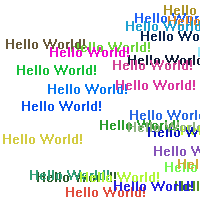 If OpenWindow(0, 0, 0, 200, 200, "2DDrawing Example", #PB_Window_SystemMenu | #PB_Window_ScreenCentered) If CreateImage(0, 200, 200) And StartDrawing(ImageOutput(0)) DrawingMode(#PB_2DDrawing_Transparent) Box(0, 0, 200, 200, RGB(255, 255, 255)) For i = 1 To 30 DrawText(Random(200), Random(200), "Hello World!", RGB(Random(255), Random(255), Random(255))) Next i StopDrawing() ImageGadget(0, 0, 0, 200, 200, ImageID(0)) EndIf Repeat Event = WaitWindowEvent() Until Event = #PB_Event_CloseWindow EndIf