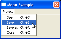 Beispiel:If OpenWindow(0, 200, 200, 200, 100, "Menu Example") If CreateMenu(0, WindowID(0)) ; hier beginnt das Erstellen des Menüs... MenuTitle("Project") MenuItem(1, "Open" +Chr(9)+"Ctrl+O") MenuItem(2, "Save" +Chr(9)+"Ctrl+S") MenuItem(3, "Save as"+Chr(9)+"Ctrl+A") MenuItem(4, "Close" +Chr(9)+"Ctrl+C") EndIf Repeat : Until WaitWindowEvent()=#PB_Event_CloseWindow EndIf