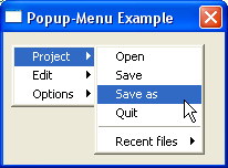 Beispiel:If OpenWindow(0, 200, 200, 200, 120, "Popup-Menu Example") If CreatePopupMenu(0) ; hier beginnt das Erstellen des Popup-Menüs... MenuItem(1, "Open") ; Sie können alle Befehle zum Erstellen eines Menüs MenuItem(2, "Save") ; verwenden, ganz wie bei einem normalen Menü... MenuItem(3, "Save as") MenuItem(4, "Quit") MenuBar() OpenSubMenu("Recent files") MenuItem(5, "PureBasic.exe") MenuItem(6, "Test.txt") CloseSubMenu() EndIf Repeat Select WaitWindowEvent() ; überprüfe Window-Ereignisse Case #WM_RButtonDown ; rechte Maustaste wurde gedrückt => DisplayPopupMenu(0, WindowID(0)) ; stelle jetzt das Popup-Menü dar Case #PB_Event_Menu ; ein Eintrag des Popup-Menüs wurde angeklickt Select EventMenu() ; ermittle den angeklickten Menü-Eintrag... Case 1 : Debug "Menu: Open" Case 2 : Debug "Menu: Save" Case 3 : Debug "Menu: Save as" Case 4 : Quit = 1 Case 5 : Debug "Menu: PureBasic.exe" Case 6 : Debug "Menu: Text.txt" EndSelect Case #PB_Event_CloseWindow Quit = 1 EndSelect Until Quit = 1 EndIf