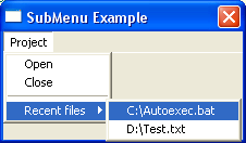 Beispiel:If OpenWindow(0, 200, 200, 220, 100, "SubMenu Example") If CreateMenu(0, WindowID(0)) MenuTitle("Project") MenuItem(1, "Open") MenuItem(2, "Close") MenuBar() OpenSubMenu("Recent files") ; beginne Erstellung des Unter-Menüs MenuItem( 3, "C:\Autoexec.bat") MenuItem( 4, "D:\Test.txt") CloseSubMenu() ; beende Unter-Menü EndIf Repeat : Until WaitWindowEvent()=#PB_Event_CloseWindow EndIf