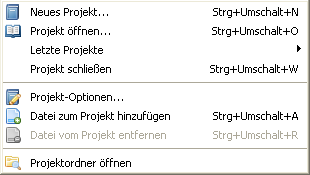 Öffnet ein existierendes Projekt. Ist zu dieser Zeit ein Projekt geöffnet, wird dieses geschlossen. Zuvor geöffnete Quellcodes des Projekts werden auch geöffnet, abhängig von der Projekt-Einstellung.