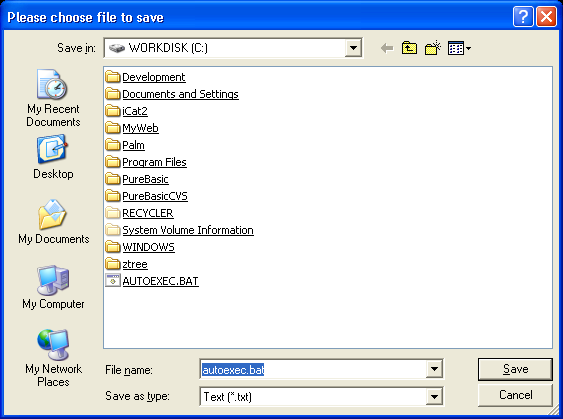 Beispiel:StandardFile$ = "C:\autoexec.bat" ; anfänglichen Pfad + Dateiname festlegen ; Mit dem nächsten String werden die Pattern (mit "|" als Trennzeichen) für anzuzeigende ; Dateitypen festgelegt: ; Erster: "Text (*.txt)" als Name, ".txt" und ".bat" als erlaubte Dateiendungen ; Zweiter: "PureBasic (*.pb)" als Name, ".pb" al erlaubte Dateiendung ; Dritter: "Alle Dateien (*.*) als Name, "*.*" als erlaubte Dateiendung, gültig für alle Dateien Pattern$ = "Text (*.txt)|*.txt;*.bat|PureBasic (*.pb)|*.pb|Alle Dateien (*.*)|*.*" Pattern = 0 ; wir verwenden den ersten von drei möglichen Pattern als Standard File$ = SaveFileRequester("Bitte Datei zum Speichern auswählen", StandardFile$, Pattern$, Pattern) If File$ MessageRequester("Information", "Sie haben folgende Datei ausgewählt:"+Chr(10)+File$, 0) Else MessageRequester("Information", "Der Requester wurde abgebrochen.", 0) EndIf
